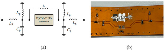 The proposed P(VDF-TrFE) BAW filter. (a) Circuit diagram for the proposed BAW filter; (b) a photo of the fabricated filter.