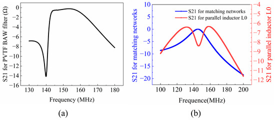 (a) The frequency response of fabricated P(VDF-TrFE) BAW filter; (b) matching networks and the parallel inductor.