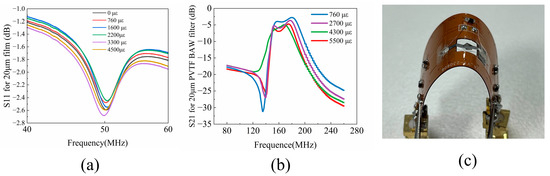 The P(VDF-TrFE) BAW resonator’s performance under strain-induced bending was investigated using a series of bending experiments. A mechanical arm (HSV-500, Qingdao TUOKEInstrument Co., Ltd., Qingdao, China) was employed to control the applied strain, while a network analyzer was utilized to measure the corresponding frequency response. Figure 7a illustrates the return loss (S11) spectra of the device under varying levels of strains. As the bending strain increases from zero to 4500 με, the resonance frequency shifts from 50.36 MHz to 49.75 MHz. The BAW resonator exhibits robust performance over a broad strain range, demonstrating the exceptional flexibility of the P(VDF-TrFE) BAW resonators. One potential factor leading to nonlinearity is the alteration of intermolecular spacing and crystal structure of P(VDF-TrFE) polymer under the influence of stress. It has a good crystal structure, which is responsible for its piezoelectric activity and elevated longitudinal sound velocity.