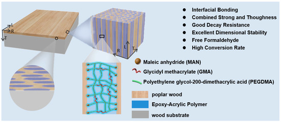 Schematic diagram of epoxy-acrylic polymer-modified (through in situ filling) aspen wood realizing compatibility of interface bonding and high performance.
