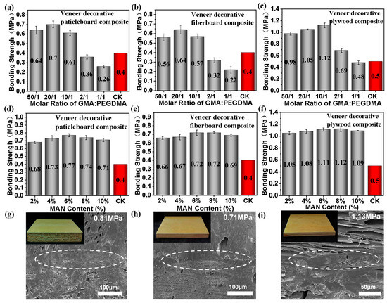 Optimization of monomer ratio based on the interfacial bonding strength between three kinds of man-made board substrates and modified veneer: optimization of GMA/PEGDMA ratio based on (a) paticleboard, (b) fiberboard and (c) plywood; optimization of MAN dosage based on (d) paticleboard, (e) fiberboard and (f) plywood; microstructure of the bonding interface of modified veneered (g) paticleboard, (h) fiberboard and (i) plywood at the optimal ratio.