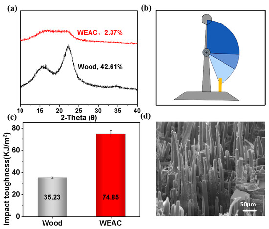 Impact toughness of polymer-modified wood: (a) XRD curves of polymer-modified wood and unmodified wood, (b) schematic diagram of impact toughness test, (c) comparison of impact toughness between polymer-modified wood and unmodified wood and (d) SEM microstructure of impact fracture surface of polymer-modified wood.