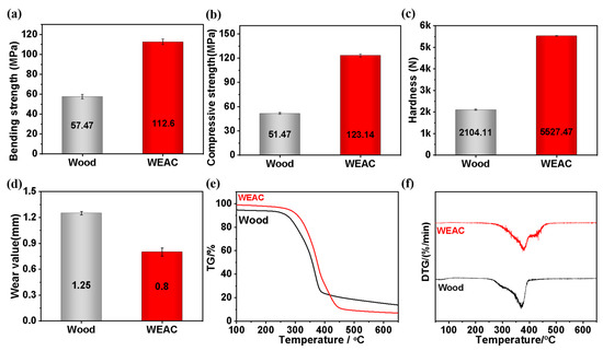 Mechanical properties and heat stability of polymer-modified wood: (a) bending strength, (b) compressive strength (rift grain), (c) hardness, (d) wear value, (e) TG curves and (f) DTG curves.