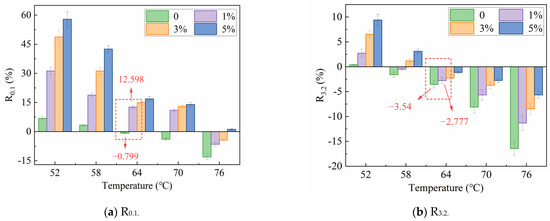 Taking the median temperature of 64 °C as the standard, the changing of Jnr and R with MBF is depicted in Figure 11. From Figure 11, the R value started to become negative at 0.1 kPa when the temperature was 64 °C, manifesting that the viscous behavior of the virgin bitumen at higher temperatures was more apparent, while the elastic performance primarily vanished. The changes in binder performance have made it difficult to recover from deformation after loading. Correspondingly, the R of the modified bitumen did not become negative until 76 °C, which was 12 °C higher than that of the virgin bitumen. This confirms again that MBF can improve the capability to resist the high-temperature deformation of bitumen. Moreover, there were differences in the change of R under two stress levels, which were reflected in a gradual increase in R3.2 and a rapid increase in R0.1. The changes in Jnr0.1 and Jnr3.2 were relatively stable, and the difference was imperceptible. The improvement of modified binders with the same content interval was uniform, which was aligned with the large deformation and small recovery of the plastic polymer-modified bitumen under creep load [39].