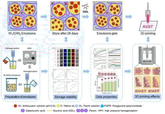 Three-dimensional printing of stable anthocyanin-loaded double emulsion gels formed by pectin and glucono-delta-lactone complexes. Reproduced with permission from Li et al. [51]. Copyright (2023), Elsevier.