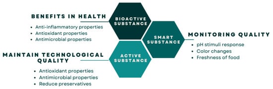 Research and food industry interest have focused around three specific targets regarding anthocyanin-loaded polymers. Firstly, improving the general health of the human body due to anthocyanins’ beneficial effects against chronic nontransmissible diseases (bioactive substance), which is reflected in the production of food products enriched with anthocyanins. Secondly, providing “intelligence” to those materials into which they are incorporated, e.g., producing so-called “smart materials” that are able to respond to external stimuli. In this sense, anthocyanins act as interactive indicators helping to assess the chemical and microbial quality of food products through pH monitoring. Finally, materials loaded with anthocyanins are “active” since they contain antimicrobial and antioxidant agents that improve food preservation and function as chemical preservatives by reducing lipid oxidation and microbial growth in packaged foods. Figure 6 shows the roles of anthocyanins as a bioactive, active, and smart substance for food applications.