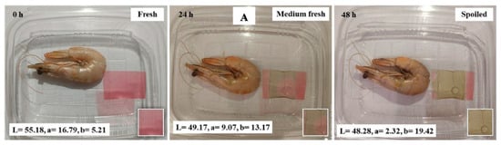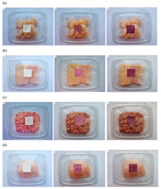 Regarding films for monitoring food spoilage, it has been shown that combining polymers improves the physical properties of the material. For example, Nadi et al. [33] showed that combining basil seed gum with chitosan and adding red cabbage extract as a colorimetric indicator improves properties such as solubility, water vapor permeability, and flexibility in the material. Recently, Li et al. [30] reported the use of a film that combines chitosan and gelatin with a butterfly pea flower anthocyanin extract to evaluate beef freshness. This combination had an outstanding sensitivity to pH changes that are not perceptible to the naked eye, and the color change could be assessed using RGB values obtained from a smartphone app (Figure 4), differentiating four basic stages: freshness, sub-freshness, onset of deterioration, and complete deterioration.