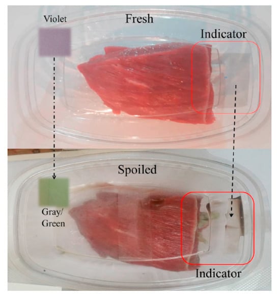 As an example of this, Khaledian et al. [37] reported a new material based on a potato starch–turnip peel extract and guar gum–cinnamaldehyde to control the growth of spoilage-related microorganisms by extending the shelf life of fresh lamb meat under refrigerated storage conditions for up to 13 days. More complex combinations that including fibers have been also evaluated, for example, in the case of anthocyanin nanoencapsulated in gelatin and immobilized on ethyl cellulose nanofibers reported by Nath et al. [38] that showed pH sensitivity that was stable up to 7 days of storage at room temperature.