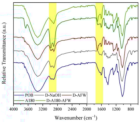 In order to examine the modifications to the solids after the performed treatments, the FTIR spectra of POB, A180, D-NaOH, D-AFW and D-A180-AFW were collected (see Figure 1).