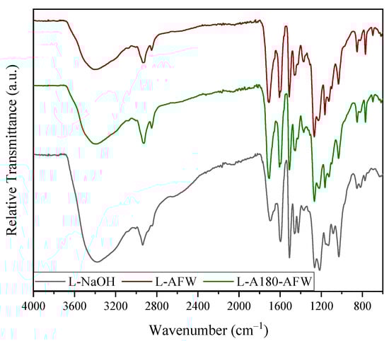 The three samples presented the typical absorption band at 3400 cm−1 corresponding to the –OH stretching vibrations, as well as the signals associated with stretching vibrations of the C–H (CH3, CH2 and CH) of lignin and polysaccharides. The peak at approximately 2850 cm−1 was less prominent for the L-NaOH sample, probably due to the presence of hemicellulosic as reported by Morales et al. (2022) for alkaline lignins [47]. The next notable change was observed at approximately 1700 cm−1, which was attributed to C=O stretching vibration in unconjugated ketone, carbonyl and ester groups [46]. This peak was more intense in the acetoformosolv lignin spectra, probably due to a higher acetyl group content derived from the acetylation reaction during this isolation method [43]. In the three samples, the characteristic peaks of aromatic skeletal vibrations were identified at approximately 1600, 1515 and 1425 cm−1, although the latter was more intense in the L-NaOH sample. The signal at 1373 cm−1 in the samples related to aliphatic C–H stretching in CH3 groups was less strong in the case of L-NaOH, which was also related to the acetylation of the lignins during acetoformosolv process [29,43]. The prominent band at 1270 cm−1 appearing in all samples was attributed to guaiacyl ring breathing with C–O stretching [29,46], and the signal at approximately 1130 cm−1 related to syringyl units was also identified [43,46]. Moreover, the peaks at 1080 and 1030 and 850 cm−1 corresponding to C–O deformation in secondary alcohols and aliphatic ethers, and aromatic C-H in-plane deformation plus C–O deformation in primary alcohols were detected [46], being more intense for L-NaOH probably due to esterification reactions in the case of organic acids. From these results, it was confirmed that the extraction method altered the structure of the obtained lignin, even if the modifications were not very significant. However, autohydrolysis did not seem to have a great effect on the isolated lignin, since both the L-AFW and L-A180-AFW samples presented almost identical ATR-FTIR spectra.