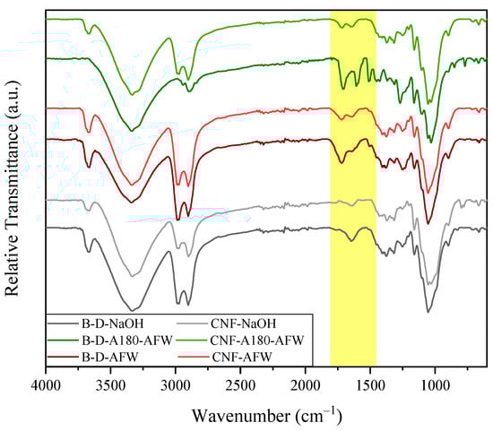 The FTIR spectra of all the samples showed the typical bands of lignocellulosic material, with some differences between them. In the range 2800–3600 cm−1, the band related to –OH stretching vibrations remained similar (3400 cm−1), the signal associated with stretching vibrations of –CH groups of cellulose and lignin (2890–2990 cm−1) were intensified, especially in the case of the A180 and D-A180-AFW samples, probably due to hemicellulosic removal [30]. The next significant variations were observed in the range 1600–1710 cm−1, which were related to the acetylation reaction during this acetoformosolv delignification method [43]. The diminution on the intensity of the signals at approximately 1510 and 1230 cm−1 in all samples, which are characteristic of C–C aromatic skeletal vibration and =C–O–C axial asymmetric strain, suggested that both hemicelluloses and lignin were removed [30,44]. The peak at approximately 1420 cm−1 in the spectrum of the raw material presented a significant reduction after any treatment. This signal can be either related to CH2 scissor motion in cellulose [45] or to aromatic skeleton vibrations in lignin [46], indicating their degradation as the peak was reduced. Nevertheless, the slight intensification of the weak signals at approximately 1320, 1160, 1110 and 1050 cm−1 associated with O–H bending, C–O–C glycoside bonds asymmetrical stretching, C–OH stretching and C–O–C pyranose ring vibration, subsequently, suggested that the presence of cellulose was more evident after the employed chemical treatments [44].