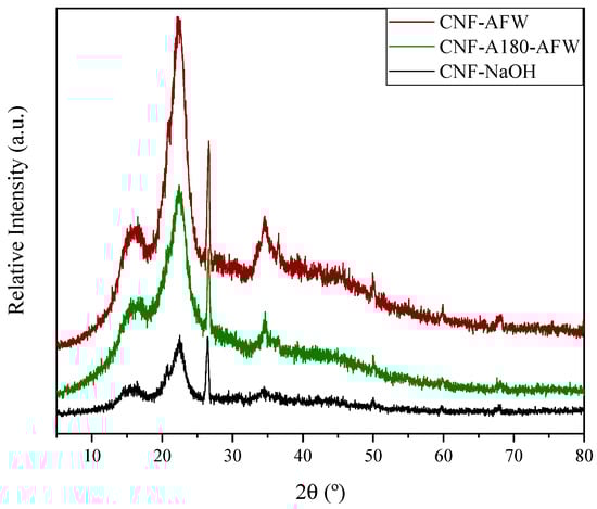 As seen in Figure 4, the diffractograms of the three CNF samples showed the characteristic peaks of cellulose [44,53]. These peaks were those appearing at approximately 16.2°, 22.4° and 34.5°, which were attributed to the (110), (002) and (004) crystallographic planes, respectively [44,54].