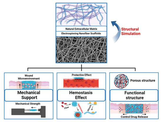 Many regenerative scaffolds for wound healing have been developed, among which the use of nanofibers to prepare tissue engineering scaffolds is a very promising solution [24]. Electrospinning is a technique for the one-step preparation of polymer nanofibers based on electrostatic forces. Nanofibers produced by this method can uniquely assist in wound healing on the basis of the following: 1. having dimensions similar to fibrin fibers, which facilitate cell adhesion and migration [25]; 2. possessing high porosity and surface area, enabling a nanoscale simulation of the fibrous network structure of the ECM, beneficial for cell proliferation and signal transduction [26,27]; 3. exhibiting good biocompatibility and mechanical strength, which do not cause significant immune rejection reactions and can support the extensive proliferation of new cells in the early stages of wound healing, promoting the formation of new tissue [28]. Additionally, by changing the spinning parameters or combining electrospinning with mixed spinning, coaxial spinning, surface modification, and other methods, scaffolds can be generated with specific structures and specific physicochemical properties [29]. When used as carriers, functional components can be encapsulated by the nanofibers through direct mixing, enabling the controlled release of these components during application [30,31]. Therefore, electrospun fibers, with their ability to mimic the ECM and serve as carriers for various functional components that promote wound healing, have become a focal point of numerous studies.