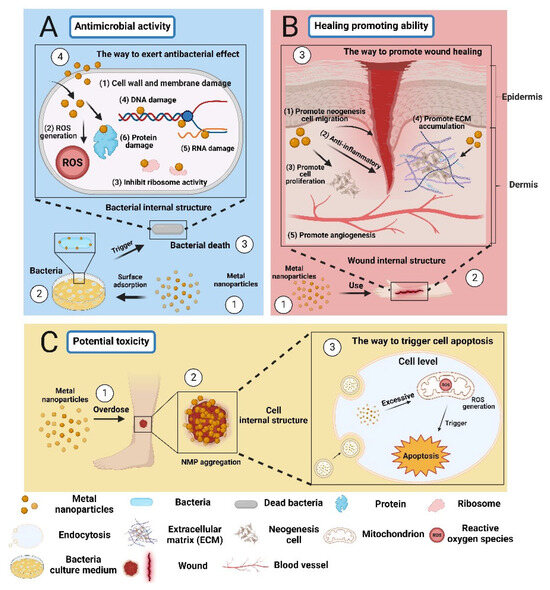 The effects of metal-based nanoparticles: beneficial and harmful aspects in wound healing. (A) The antimicrobial activity of MBNPs (B) The healing promoting ability of MBNPs (C) The potential toxicity of MBNPs. “Created with BioRender.com.” Agreement number: CN2684TD8X.