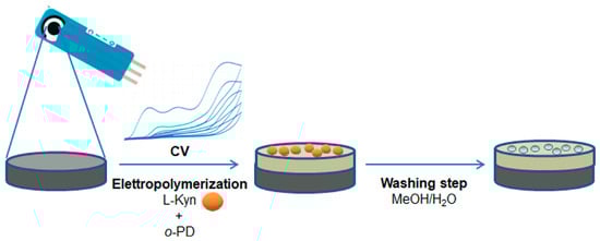 After the o-PD-l-Kyn complex formation, a drop of the mixture was deposited onto the SPCE surface and subjected to electropolymerization via CV in a potential range between 0.0 and +1.6 V and with a scan rate of 100 mV/s (Figure 1). The choice of the scan cycle number is important during modified sensor construction since it permits the modulation of the thickness of the polymeric layer on the working electrode and, consequently, its performance.