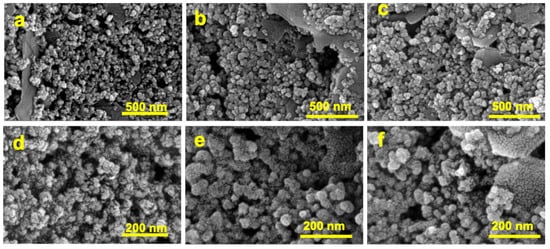 In-plane SEM images of work electrode of bare SPCE (a), kyn-MIP-SPCE (b), and NIP-SPCE (c) at 200,000× and bare SPCE (d), kyn-MIP-SPCE (e), and NIP-SPCE (f) at 500,000×.