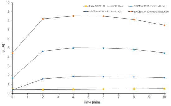 kyn-MIP-SPCE was tested with different concentrations of l-Kyn (10–100 µM) via SWV analysis, a very sensitive electroanalytical technique widely used in electrochemical analysis. To evaluate the time of incubation necessary to obtain a stable signal, kinetic studies were performed following the Ip during 10 min. In Figure 5, kinetic curves, obtained by incubating the modified sensor with different concentrations of l-Kyn standard solutions, were reported. As can be seen, after 2 min the current became stable, and a plateau was reached. The graph also reported the kinetic performance of a bare SPCE, incubated with 10 μM of l-Kyn standard solution that demonstrated the effect in terms of sensitivity of the presence of the imprinted polymeric layer electropolymerized on the sensor. Considering this result, all following analyses were performed incubating all standard solutions for 6 min to ensure the stability of the Ip.