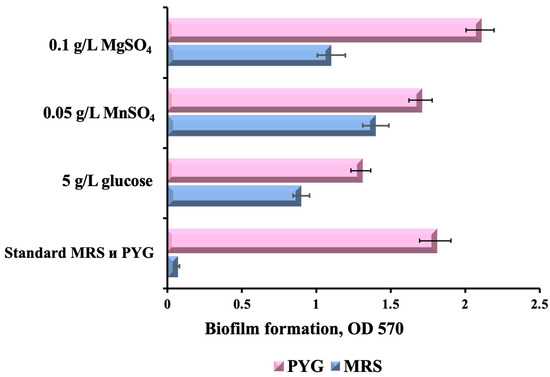 It is well known that bacterial adhesion, as the initial and most crucial stage of biofilm formation, is strongly influenced by divalent cations as they determine electrostatic interactions between the contacting surfaces [29]. In our study, the supplementation of glucose-free MRS with MnSO4 (0.05 g/L) showed a distinct stimulating effect on biofilm formation, while the addition of MgSO4 (0.1 g/L) resulted in a relatively slight increase. The observed difference is likely due to different growth-stimulating activities of these salts. As previously described by Imbert et al., for lactobacilli, including LGG, Mn2+ strongly stimulated growth in suspension [34], while no such stimulation was observed for Mg2+. As reported by Dertli, the removal of a solution of salts containing Mn2+ and Mg2+ from MRS medium significantly reduced the formation of L. johnsonii FI9785 biofilm and its mutants, possibly due to the essential role of these metal ions in cellular metabolism [35]. We also observed that the introduction of Mn2+ into PYG medium did not significantly affect the efficiency of biofilm formation, while the addition of Mg2+ stimulated its formation. Thus, among the tested culture media modifications, the optimal for biofilm formation seems to be PYG medium supplemented with 0.1 g/L of MgSO4.