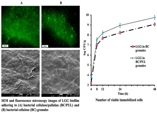 Incubating granules in PYGm broth for 48 h, to allow biofilm formation, increased cell counts in approximately 1–1.7 log. The average of three assays showed that bacterial counts in BC granules rose from 1.03 × 108 (8.01 log CFU/g) to 1.20 × 109 CFU/g (9.07 log CFU/g), while in BC/PUL to 5.64 × 109 CFU/g (9.75 log CFU/g) (Figure 4). The high volume of bacteria included in both variants of granules indicates that the immobilization process was adequate, and the carrier materials were compatible with the probiotic strain. The structure of cellulose granules is quite “spongy”, so nutritional substances from the environment could diffuse into the internal space of the granules, ensuring the growth and reproduction of strain cells not only on the surface but also inside.