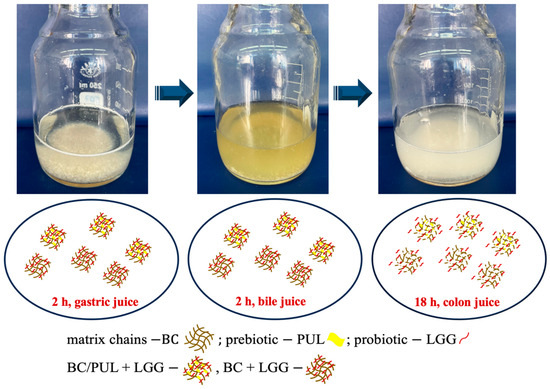 The collected experimental data obtained allow us to argue that BC acted as a spacious “shelter” capable of accommodating a significant number of LGG cells, and PUL acts as a prebiotic, stimulating the growth of probiotic cells and the formation of a biofilm by them. A bacterial biofilm presumably serves as a protective “barrier” that protects these shelters. This barrier remained closed when faced with adverse conditions, such as gastric acid and bile salts. However, it opened up upon reaching the target site (the colon), enabling the probiotic cells to effectively colonize the intestine.
