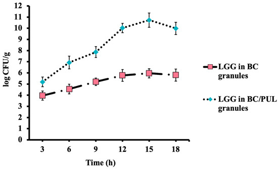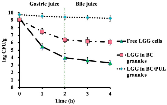 In this part of the study, we assessed and compared the protective effect of LGG immobilization in BC and BC/PUL granules in the presence of GI fluids (Figure 5).