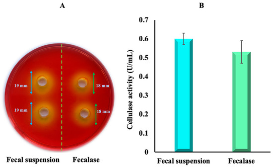 The method described by Balla A. et al. [26] was modified and used to compare the cellulolytic activities of the fecal enzyme extract and fecal suspension. The assay was carried out by adding 100 µL of samples to the wells containing carboxymethyl cellulose (CMC) (1%, w/v) agar medium and incubating at 30 °C for 24 h. Congo red solution (1%, v/v) was used to reveal the zone of cellulose hydrolysis that forms around the well after the addition of the solution (15 min), followed by discoloration with a NaCl solution (1 M) for 10 min. The diameter of the clear zones surrounding the wells was measured to evaluate the cellulase activity. The enzymatic index Ei was determined using the following equation: