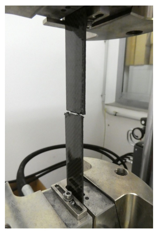 From each cured laminate, 5 test specimens of dimensions 250 × 20 × 2 mm, intended for tensile testing, were cut using a water jet. The test was carried out according to the ISO 527-4 standard on a Zwick Vibrophore 100 testing machine. Hydraulic jaws secured the test specimen with a pressure of 30 bar. At the beginning of the test, an extensometer was attached to the specimen, which measured the tensile modulus in the range of 0–0.25% L0. After that, it was removed from the specimen, and the test continued without it. The tensile properties were measured until the specimens broke (Figure 4) [25].