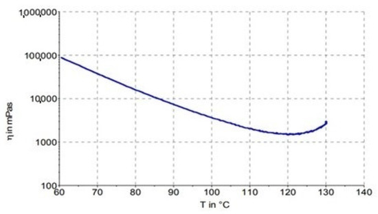 To meet the optimization criterion, it was necessary to extend the processing area when the resin has a low viscosity. At this point, it better impregnates the fibers, allows voids to escape from the laminate, and, in addition, its excess drains into the breather cloth [21]. Here, the course of viscosity measured by the prepreg manufacturer and the experiment [7] was used.