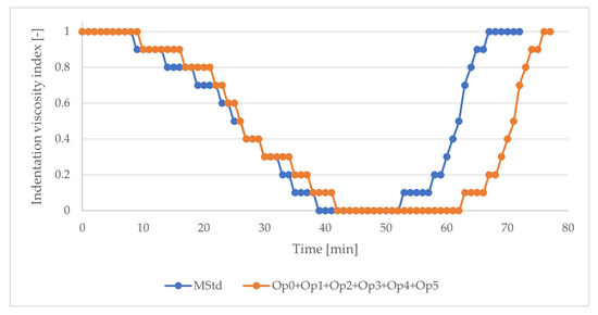 The course of the index of indentation viscosity of the prepreg (blue: MStd; orange: Op0, Op1, Op2, Op3, Op4, Op5).