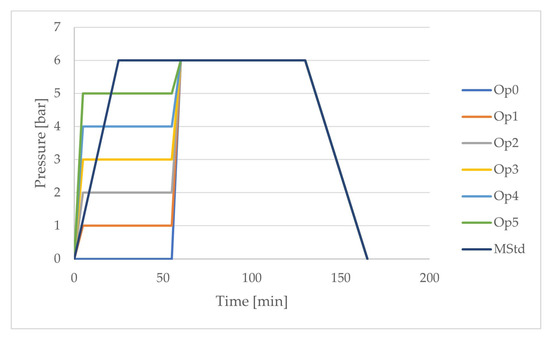 Based on the theoretical and experimental study, curing cycles were designed to determine the optimal setting of curing parameters with respect to the selected mechanical properties of the laminate. Cycles with the names Op0 to Op5 and MStd were compared. The letters in the names of the curing cycles with the initial letter O express the value of the pressure in bars during the first heating and the first dwell of the optimized temperature course of the curing cycle. The curing cycle with the name MStd contains the curing parameters recommended by the material manufacturer. The pressure courses are shown in Figure 8 and Table 4.