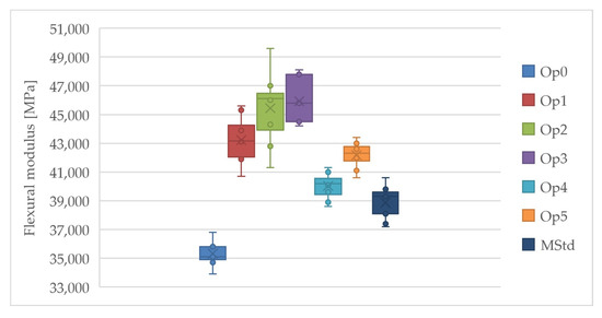 Curing cycles Op3 and Op2 achieved the highest values of the average flexural modulus, while the lowest values were achieved by Op0, MStd, and Op1 (Figure 10). Very high values of the average flexural modulus were also achieved by cycle Op1. The average flexural modulus values of curing cycles Op4 and Op5 are statistically located roughly in the middle of the range of all measured values. These cycles have the lowest standard deviation. The lowest uncertainty of type A measurements was found for curing cycles Op0, Op4, and Op5. Conversely, MStd, Op3, Op1, and Op2 exhibited higher values in that order. The low coefficient of variation values demonstrate the minimal dispersion in the measured values and the high accuracy of the calculated arithmetic mean.