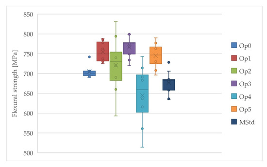 The highest value of the average flexural strength was also achieved using curing cycle Op3, while the lowest value was achieved by curing cycles Op4 and MStd (Figure 11). Very high values are also reached by the average flexural strength at Op1 and Op5. The curing cycle Op2 contains the most extensive dispersion of the measured values. The average flexural strength values were achieved by curing cycle Op0 within the set of all measurements, but the range of the values of this cycle is the lowest.