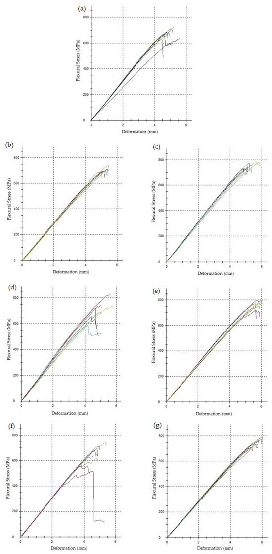 Flexural stress–deformation curves ((a) MStd, (b) Op0, (c) Op1, (d) Op2, (e) Op3, (f) Op4, (g) Op5).
