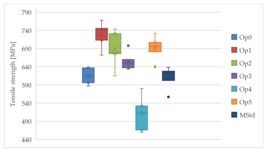 Cycles Op2 and Op4 exhibit the highest values of sample standard deviations, type A measurement uncertainty, and coefficient of variation. The higher dispersion of values can also be observed in Figure 14. In contrast, the remaining cycles exhibit comparable sampling standard deviation, coefficient of variation, and type A measurement uncertainty. All realized cycles have a relatively reasonably large dispersion of the measured values, indicating the production’s reliability and the reliability of the measurement itself. Regarding tensile strength, the Op4 cycle exhibits a lower value than the MStd baseline cycle.