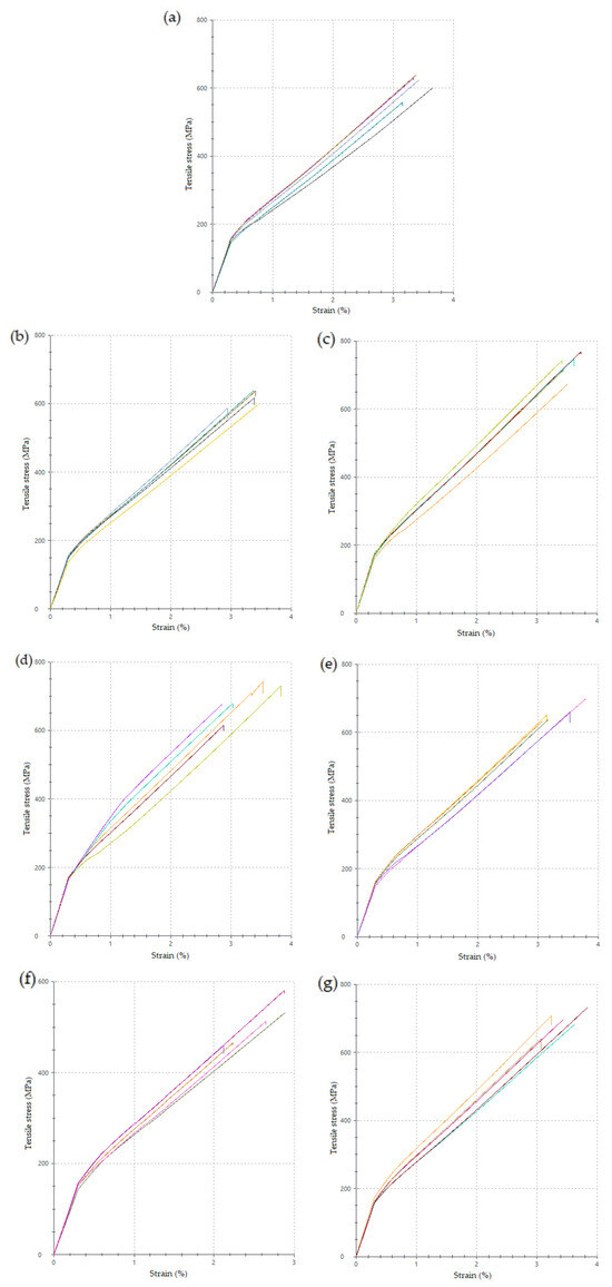 Tensile stress–strain curves ((a) MStd, (b) Op0, (c) Op1, (d) Op2, (e) Op3, (f) Op4, (g) Op5).