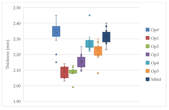 Comparison of the thickness of the cured laminates (dark blue: MStd, blue: Op0, red: Op1, green: Op2, purple: Op3, light blue: Op4, orange: Op5).