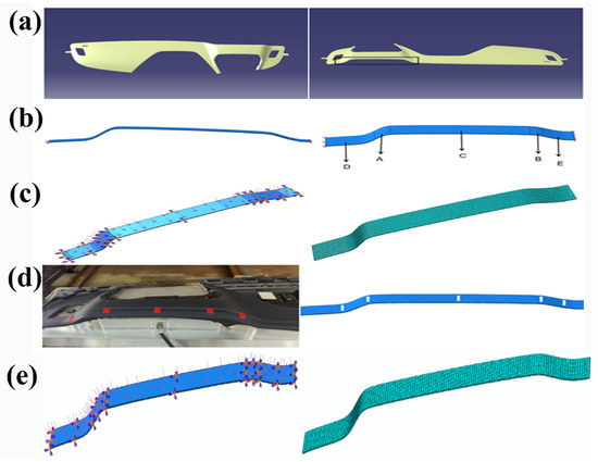 (a) Car dashboard and area selected for simulation within the black box on the dashboard; (b) local three-dimensional model of the dashboard and diagram of the model’s region partitioning; (c) boundary conditions of the model and applied pressure and the mesh partitioning of the model; (d) diagram of the area of the dashboard used for the specimen, marked in red, and a schematic diagram of the model’s region-partitioning marking; (e) boundary conditions of the model along the thickness direction, with the mesh division of the model along the thickness direction.