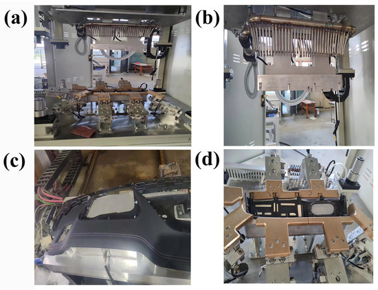 (a) Interior of the fully automatic wrapping device; (b) the hot air duct; (c) the workpiece; (d) the workpiece in the mold clamping device.