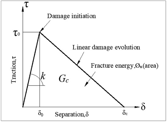 Currently, the two commonly used models for material damage in the field are linear elastic fracture mechanics (LEFM) and the cohesive zone model (CZM). The LEFM model requires prior knowledge of the crack’s damage path, whereas the CZM model does not require prior knowledge of the crack initiation damage. Therefore, the advantage of the CZM model lies in its ability to handle damage without prior information about the crack [25]. As external forces and temperature must be applied simultaneously to the material in the experiments, it is crucial to consider the coupling of temperature and external loading. This paper uses a bilinear principal structure equation to model cohesion (as shown in Figure 3), where is the fracture toughness, is the material strength, and K is the initial stiffness of the material [27,28].