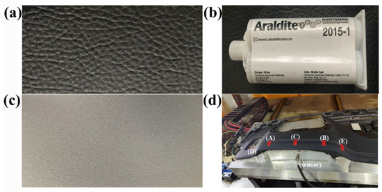 This study focuses on the localized bonding structure of the automotive dashboard (as shown in Figure 1d), comprising three layers: the top layer (PU leather), the middle layer (Araldite® 2015 two-component epoxy resin adhesive), and the bottom layer (3-D mesh fabric).