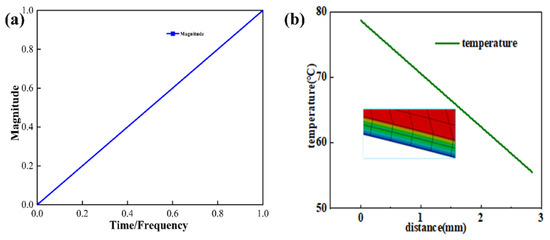 Therefore, based on the partitioned simulation of the model, this study proposes a new processing technique using ultrasonic assistance. It was determined that the temperature in region C reaches 55 °C, while in regions D and E, it is also 55 °C. Meanwhile, in regions A and B, the temperature is maintained at 45 °C (partition is shown in Figure 1b). The fitted ultrasonic wave was applied to the utilized pressure and temperature loadings in amplitude, with the circular frequency set at 125,600, the starting time set at 0, and the initial amplitude set at 1.5; in this amplitude set, A and B were each set at 0 and 0.5. The applied ultrasonic assistance followed Equation (17) above; this is shown in Figure 10a. In the article, the temperature ramp-up during the direct simulation and sectional simulation of the interior component is applied according to Figure 6a. Subsequently, in the model’s ultrasonic-assisted processing step, the temperature ramp-up is applied following Figure 10a. In both processes, the objective is to gradually raise the temperature from 25 to 70 °C.