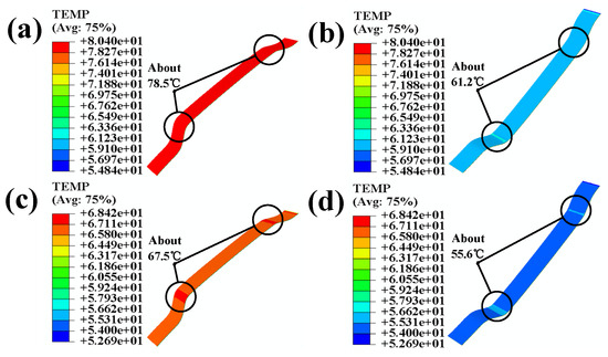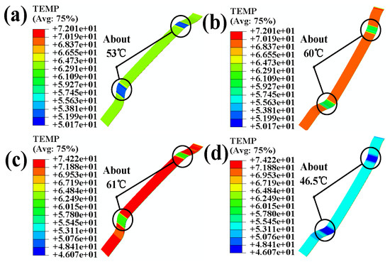(a) Temperature nephogram of the adhesive; (b) stress nephogram of the adhesive; (c) displacement nephogram of the adhesive; (d) strain nephogram of the adhesive.