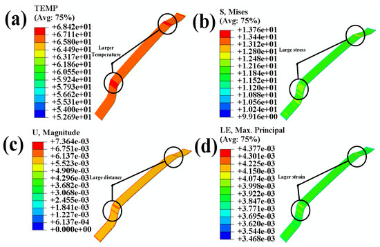 Figure 8a shows that higher temperature concentrations occur in those areas of adhesion with more significant curvature than the flat regions. Figure 8b reveals the higher stress concentrations in those areas of adhesion with more significant curvature than the flat regions. Figure 8c indicates the significant displacement variations in areas of adhesion curvature. Finally, Figure 8d demonstrates the significant strain in areas of adhesion curvature.