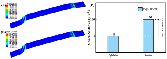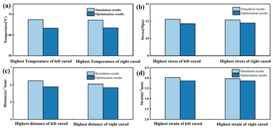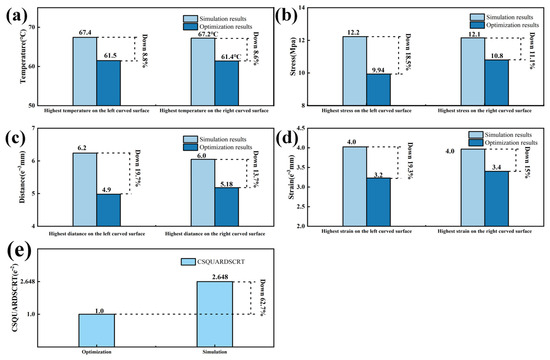By observing Figure 8 and Figure 12, it can be seen that there is a significant decrease in temperature, stress, displacement, and strain at the curved surfaces of the automotive interior component. To better demonstrate the significant improvements in automotive interior component manufacturing achieved through the integrated ultrasonic zoning optimization simulation, this study compares the results of the direct manufacturing simulation and the integrated ultrasonic zoning optimization simulation shown in Figure 13.