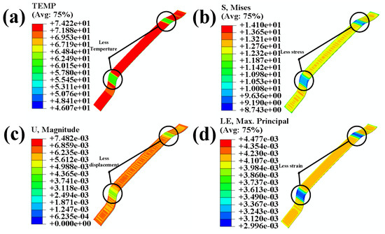 (a) Temperature nephogram of adhesion; (b) stress nephogram of adhesion; (c) displacement nephogram of adhesion; (d) strain nephogram of the adhesive.
