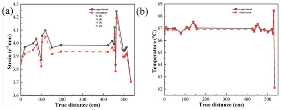 (a) Experimental and finite element comparison of strain; (b) experimental and finite element comparison of temperature.