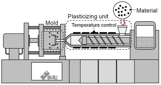 The typical setup of an IMM is presented in Figure 1. During the discontinuous process, the material is fed to the plasticizing unit, in which the granules are plasticized. The melting is achieved by the temperature control of the attached heating bands as well as the rotational movement of the screw. To mold the viscous melt, the machine performs a feed movement of the screw to inject the plastic into the cavity of the mold. Thereby, the feed rate as well as the amount of plastic injected are determined by the flow rate and the start and end position of the screw during injection, which are specified by the machine operator.