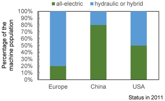 The advantage of injection molding is that the injection mold is exchangeable, so that different parts can be produced on one machine, or in other words, one mold can be operated on different machines. This offers plastics processing companies a certain flexibility in their choice of the material–mold–machine combination (MMMC) if compatibility is given. However, every MMMC results in a different production scenario which means that the processes have to be set up anew. This is due to the fact that the machine influences the process as well as the process result by its specific behavior. On the market, there are various types of injection molding machines available, including those equipped with electric variable displacement pumps, hydraulic machines with variable displacement pumps, hydraulic machines with variable motors, and all-electric machines. A study for Euromap (www.euromap.org, accessed on 15 October 2023) in 2011 has shown that the percentage of machine population is region-specific, as can be seen in Figure 2 [1]. The study showed an increase in electric machines in Europe, so it can be assumed that the current market population of electric machines is higher.