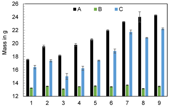 Ejected polymer mass using the three injection molding machines A, B, and C, by varying the machine’s setting parameters (n = 6).