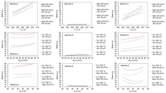 In addition to the start-up behavior, the behavior of the machine in a steady state is of interest. For this purpose, the influence of the machine type on the polymer mass depending on the machine settings was studied. Therefore, the experimental design from Table 4 was used to set different operating points of the machine. Immediately after each cycle, the mass of the ejected polymer was measured, which is presented in Figure 4.